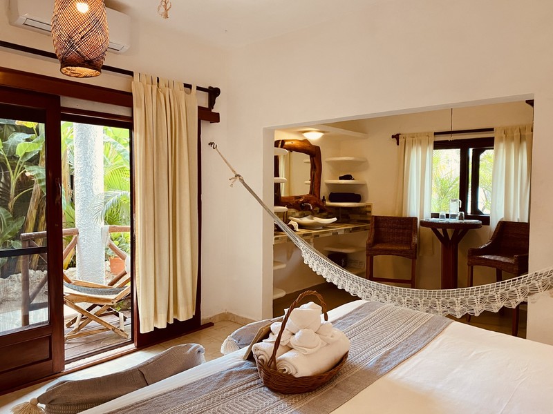 Habitaciones hermosas con cama king size, baño interior, hamaca dentro de la habitación, terraza . Vista al jardín. No está frente a la piscina, ofrece mas privacidad.Ocupa un área de 25 m2.