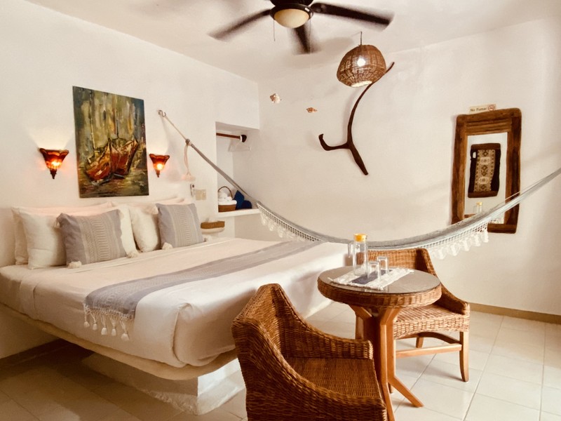 Lindas habitaciones decoradas en un ambiente romántico. Cuenta con ventilador, aire acondicionado, baño con amenidades elaboradas con productos naturales de la región, cama King size, hamaca y balcón con vista al jardín y/o a la piscina. Ocupa un área de 20m2.